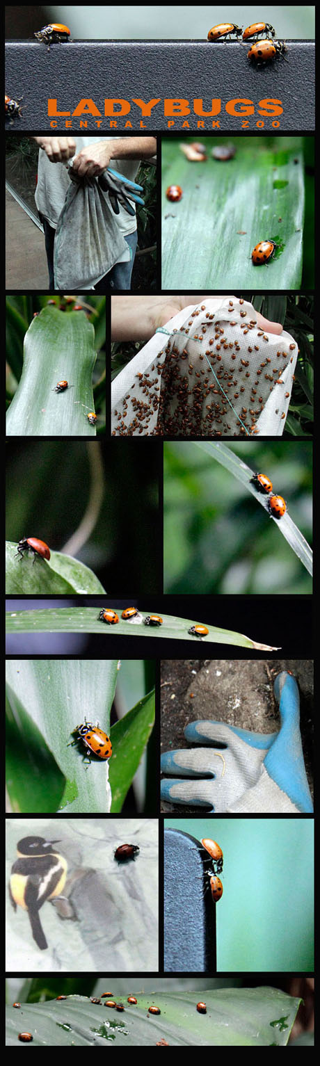 I took these photos back on Sept 21, 2011 when the horticulturist at the Central Park Zoo released a gazillion ladybugs into the tropical rainforest as eco-friendly aphid control. It was fun to watch and those wonderful, industrious ladybugs work very quickly. Enjoy the photos.