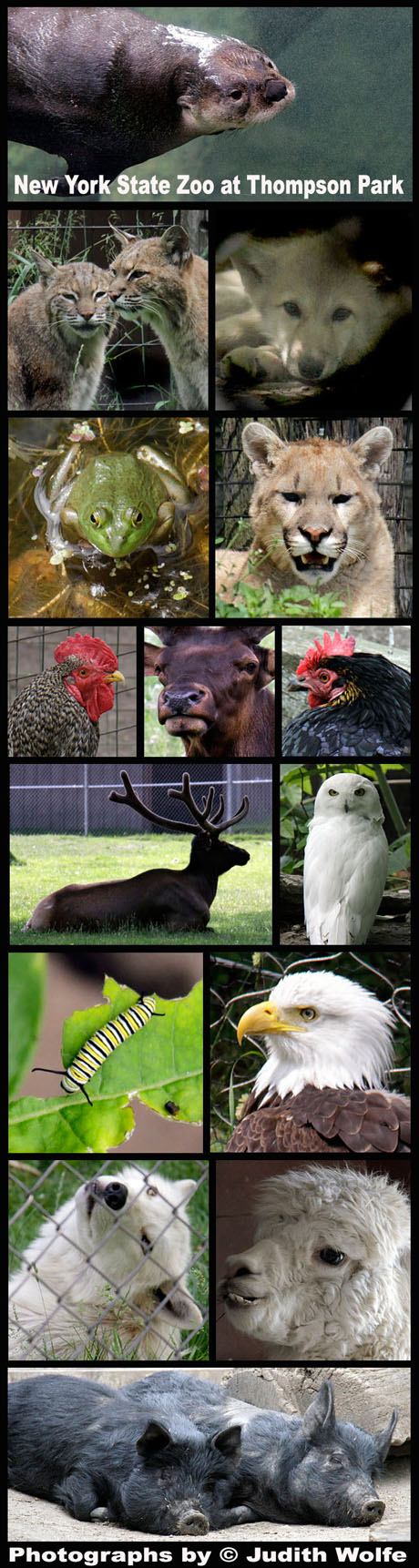 Zoo #2 on our summer zoocation was The New York State Zoo at Thompson Park in Watertown, NY. Zoo news promised us wolf pups, so off we drove. We got a little peek at a few of them through cyclone fencing and deep wooded cover. I cannot say that I blame the little pups for taking naps — but we sure wanted to see them frolicking. Oh well – it was a nice small zoo with some active animals. Enjoy.