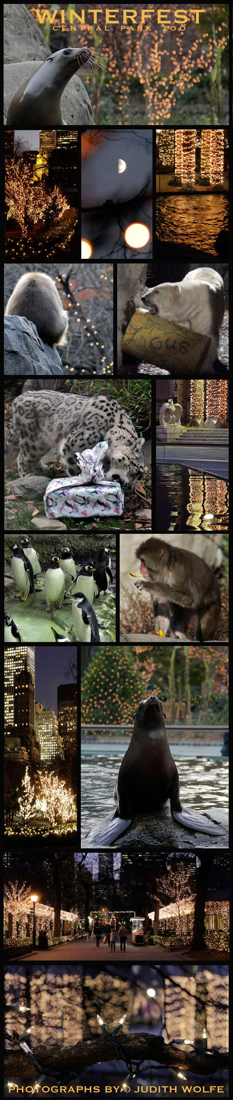 I enjoyed the first evening of Central Park Zoo’s Winterfest this past Friday night. It was fun and beautifully lit with thousands of lights. I hope my photos below reflect the beauty of the event. There are still two Fridays and Saturdays in December to enjoy the zoo until 6:30 p.m. You can stop by in the afternoon or after work for a stroll under thousands of twinkling lights. Visit cold-weather creatures, enjoy crafts and Wildlife Theater, see two wintry 4-D features, and watch the animals enjoy fish-cicles, fruits, and other favorite treats during holiday enrichment sessions. For a break from the chilly air, warm up with birds, lemurs, and tortoises in the Tropic Zone, a steamy 80 degrees all year long. You can also do some holiday shopping at the Zootique and enjoy treats and hot cocoa in the Dancing Crane Cafe.