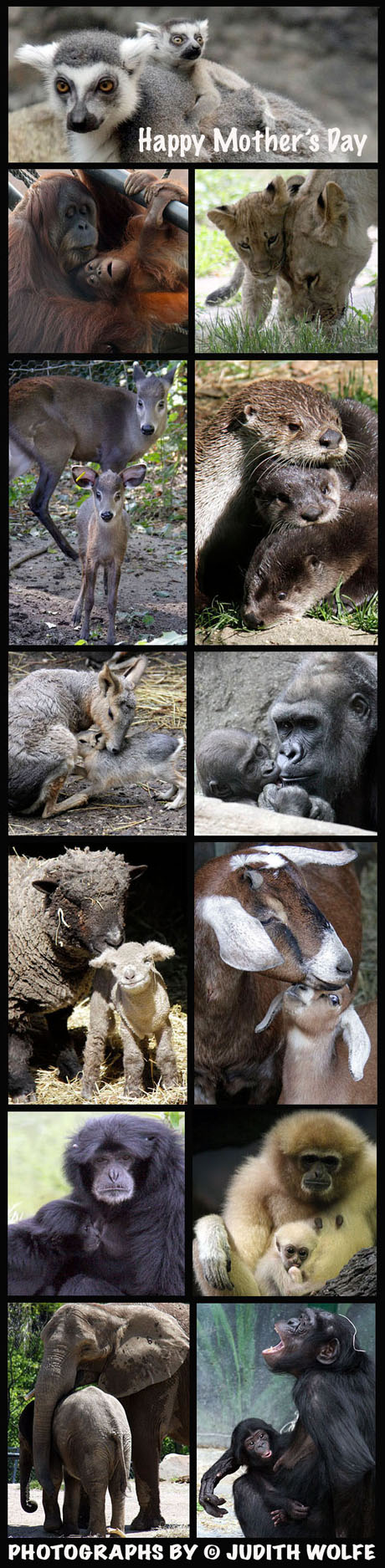 My mother, Lillian Wolfe, is long gone, but her advice, warnings and general ‘Lili-isms’ live on in my daily life. She taught me to fight the good fight, to write letters to City Hall when I was pissed and she also gave me my moral compass (one glance from Lillian told me instantly whether my behavior was acceptable or not – and I got a lot of glances). My sister Terry and I remember many childhood events differently but we both agree that our mother was a pistol. Here’s to Lillian Wolfe and all of the other mothers, caregivers, nurturers, pamperers, surrogates and loving coddlers out there. You make it all work. And a huge salute to all of the Zoo mothers in today’s photo montage.