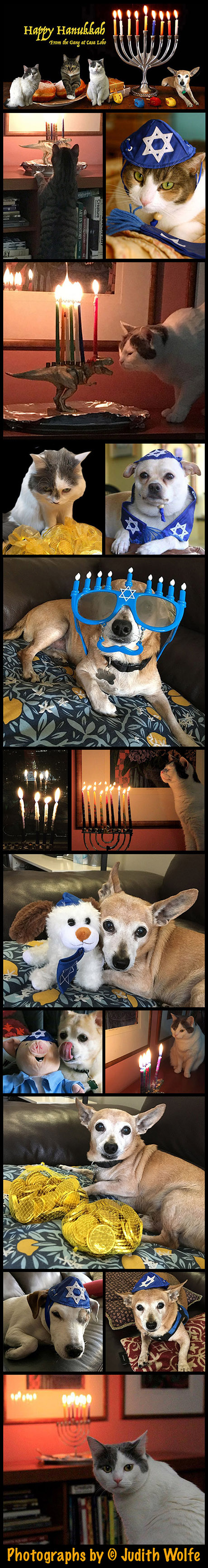 Tonight is the first of eight nights of Hanukkah. It isn’t really an important holiday on the Jewish calendar but since it falls so close to Christmas it has become more about merchandise (and of course food). We celebrate just about everything here at Casa Lobo. Here are some fun photos from the past and present. A shout out to my very cooperative pets over the years – Madison, Benny, One-eyed Jack, Roberta, Audrey Pete and of course, Mr. Pepe. Let’s all add a ‘J’ to that Oy!