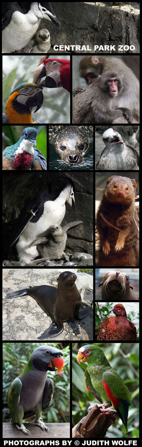 This week’s photo montage features the Central Park Zoo‘s fast growing Chinstrap penguin chick, one of the adorable new dwarf mongoose that can be seen upstairs in the Tropic Zone building, two fabulous feathered macaws, Bruiser the sea lion pup and more. If you would like to see these photos larger go here.