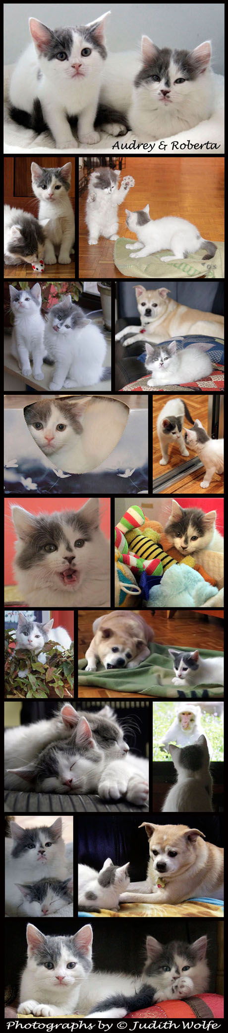 Meet my two new kittens – Audrey and Roberta. They are seven weeks old and have been exploring every nook and cranny in my home. They are curious about Benny the dog (he seems to like them a lot) and rightfully cautious about Madison the cat. They are endlessly entertaining. Enjoy!